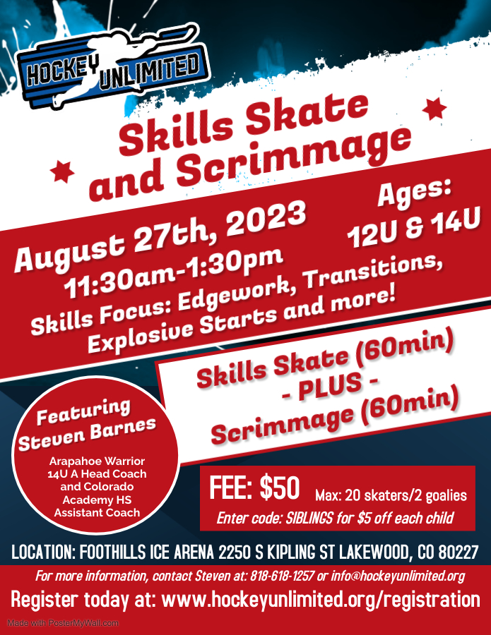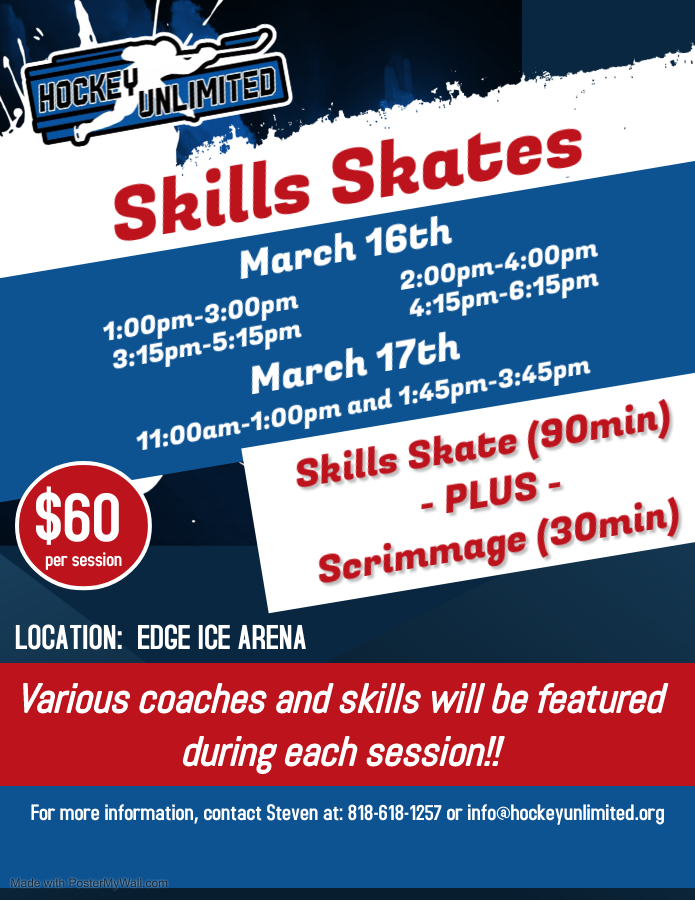Edge Ice Arena 6623 South Ward St., LittletonWhere: Edge Ice Arena 6623 S Ward St Littleton, CO 80127 When: Saturday, March 16th 2024 @ 1:00pm - 6:30pm Sunday, March 17th 2024 @ 11:00am - 4:00pm Details: Back by popular demand...join us for 2 days worth of clinics featuring a variety of highly skilled coaches, focusing on a variety of important hockey skills! …