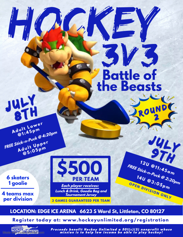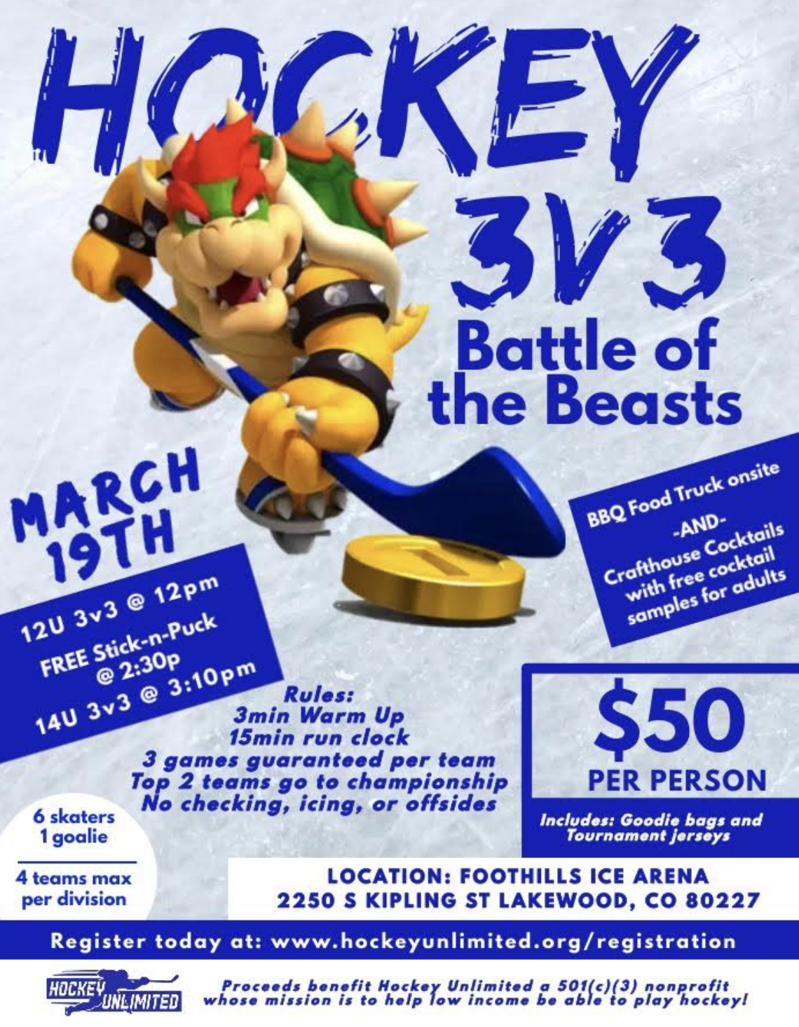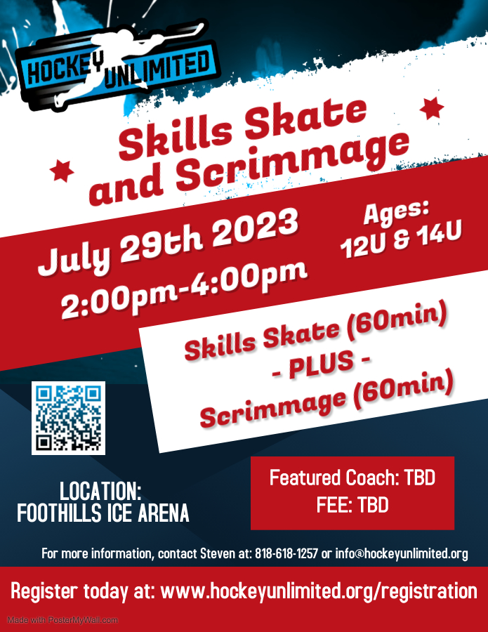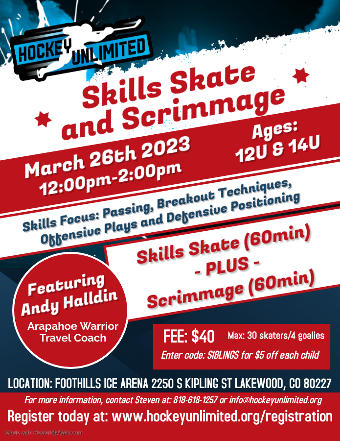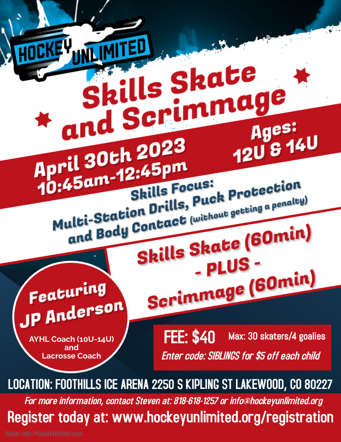 Foothills Ice Arena 2250 S Kipling St, Lakewood, COWhere: Foothills Ice Arena 2250 S Kipling St Lakewood, CO 80227 When: Sunday, February 26th 2023 @ 3:30pm - 5:30 pm Details: Skills Skate - 1 hour plus Scrimmage - 1 hour Fee: $40 Maximum 30 skaters + 4 goalies Special Offers: Sibling discount available. Enter coupon code "siblings" and receive $5 off each …